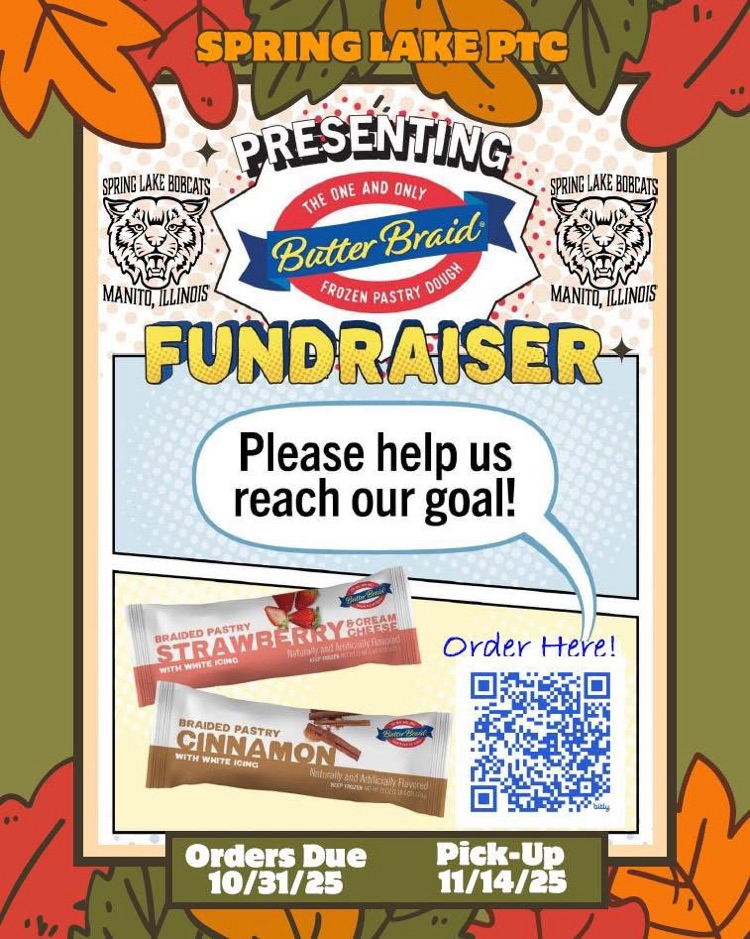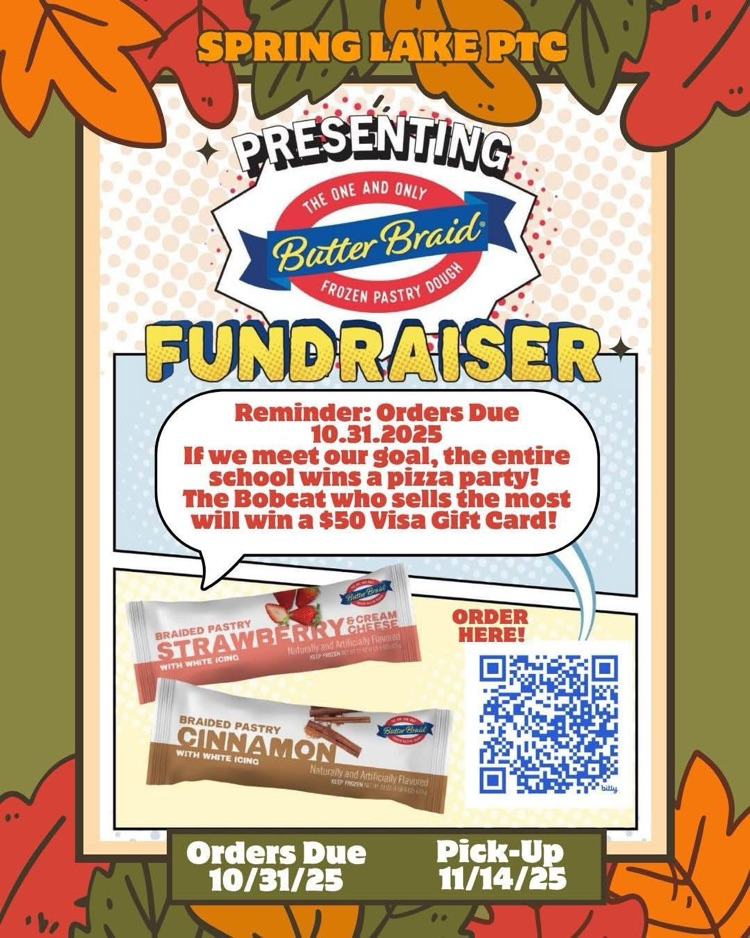 Our Butter Braid fundraiser has officially begun! We're raising money for our Mighty Bobcats and the activities we do at school! Orders are due by 10/31/2025, with pick-up at the school on November 14 from 5:00 p.m. - 8:00 p.m. Or, you can arrange delivery by your favorite Bobcat. Contact your Bobcat today to place your order, or you can order here https://bit.ly/slakebutterbraid. Thank you for your support! #ButterBraidFundraiser #SpringLakeBobcats!