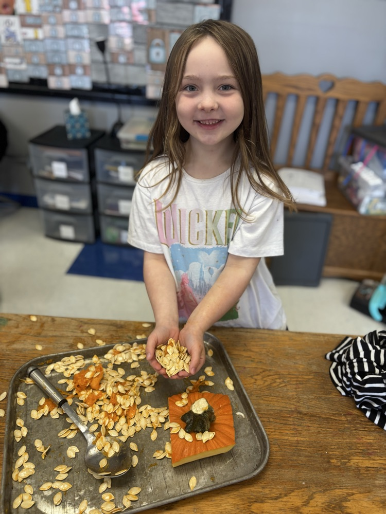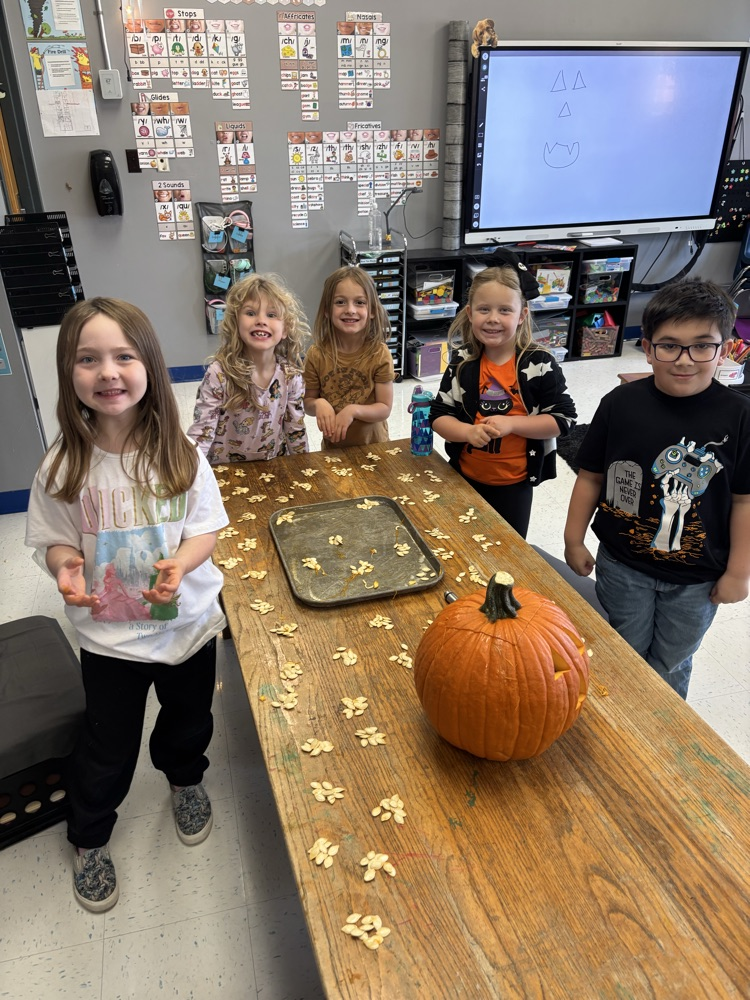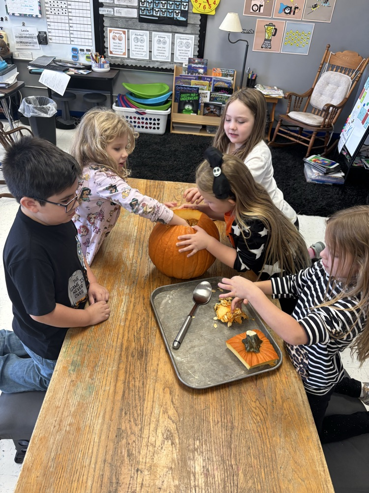 First grade is getting into the fall and Halloween spirit! 🍁🎃 This month, our students learned all about pumpkins, and today, they even carved one! They combined math and science by counting all the seeds, grouping them by tens and then hundreds for a grand total of 546 seeds!