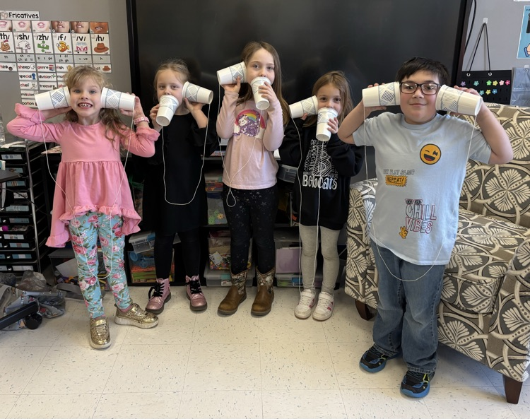 They've explored sound, light, and heat energy. To learn about sound energy, students made cup phones using two cups and a tight string. When a student talked into one cup, the cup and string vibrated, and the sound traveled all the way to the other cup! We learned that sound moves through vibrations and works best when the string is pulled tight.